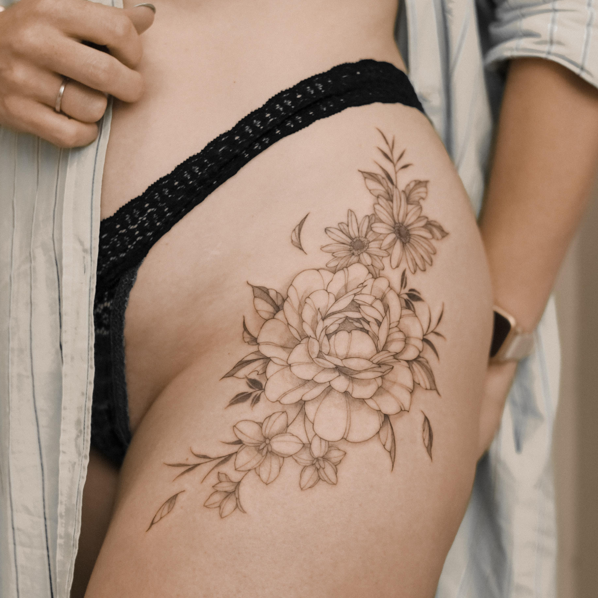 Black & white Floral hip Tattoo informatie Artiest Ruud van Eijndhoven Stijl Fineline Vorige Volgende